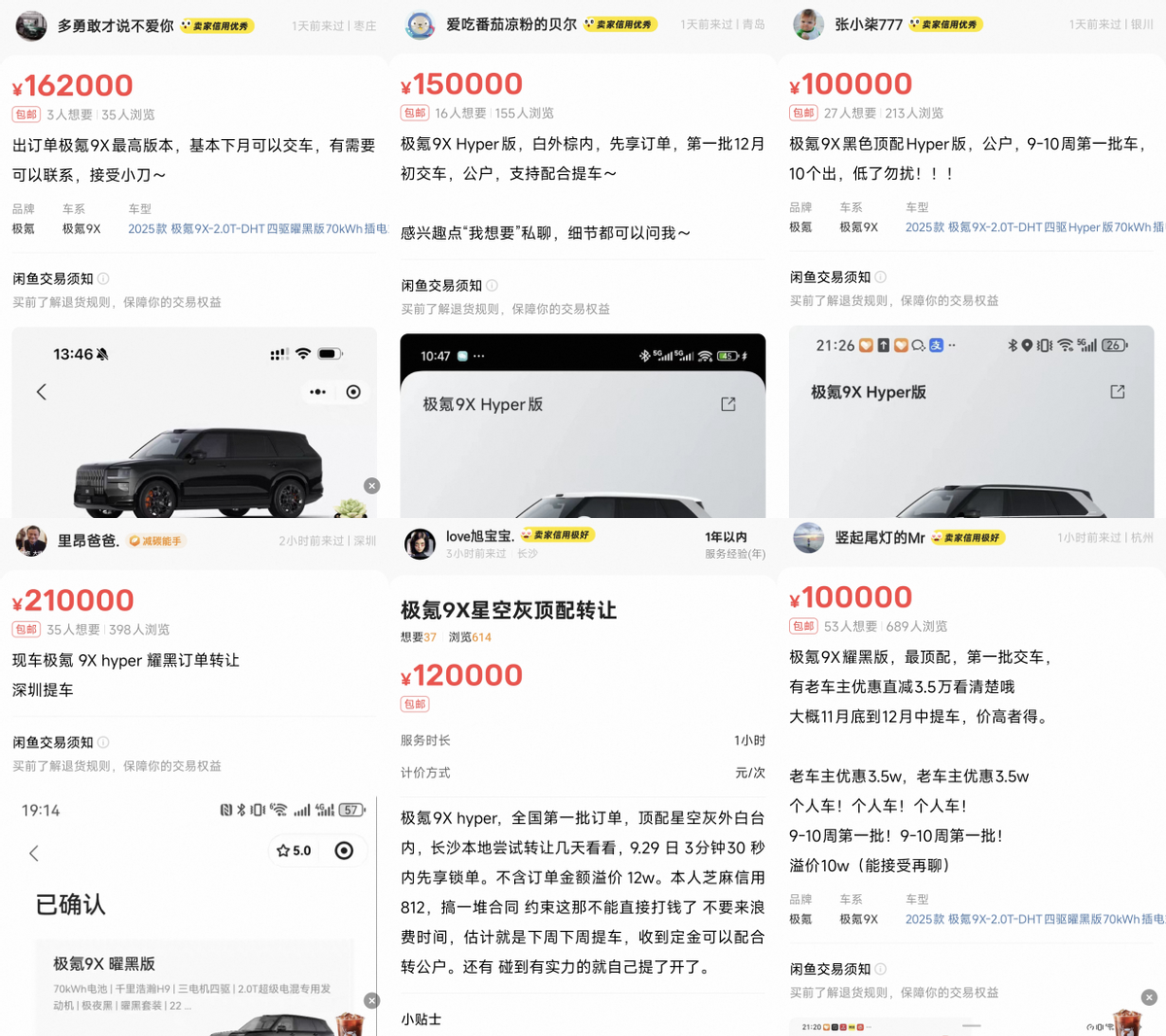 “极氪9X(参数|询价)现在已经变成硬通货了,订单加价8.8万元出手还算少的,出口的订单据说能加到20多万元。”一位汽车博主在社交媒体上这样写道。在闲鱼等二手交易平台上,极氪9X订单转让市场近期的活跃度确实令人惊叹:Hyper版车型的订单加价幅度高达8-21万元,即使是普通版也普遍存在2万至5万元的加价。