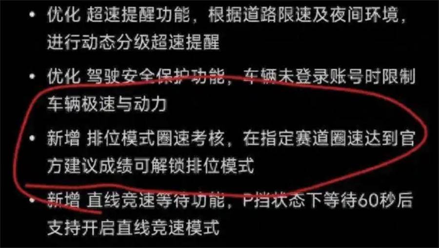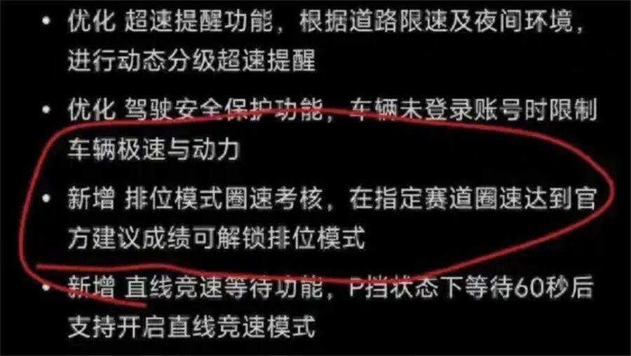 结果5月份,一次常规看上去很“互联网”的OTA更新,把这台车推上了风口浪尖:升级1.7.0后,不少车主发现马力被“腰斩”,只能跑到约900匹,想要解锁全功率还得满足特定赛道成绩条件。舆论给它取了个很直白的名字——“锁马力”事件。