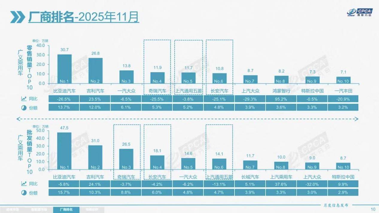 日前,乘联会发布了11月份全国乘用车市场分析报告,11月份全国乘用车市场零售222.5万辆,同比下降8.1%,环比下降1.1%,乘联会分析认为,这种情况基本符合年初判断的“前低中高后平”的走势。在零售销量排行榜中,最大的变化是鸿蒙智行(参数|询价)首次闯进了前十,而其他进入排名前十的车企,仅吉利汽车和上汽通用五菱保持了销量的同比增长。