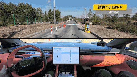 领克10 EM-P表现更好些,先停车,道闸抬起后,自动加速离开。
