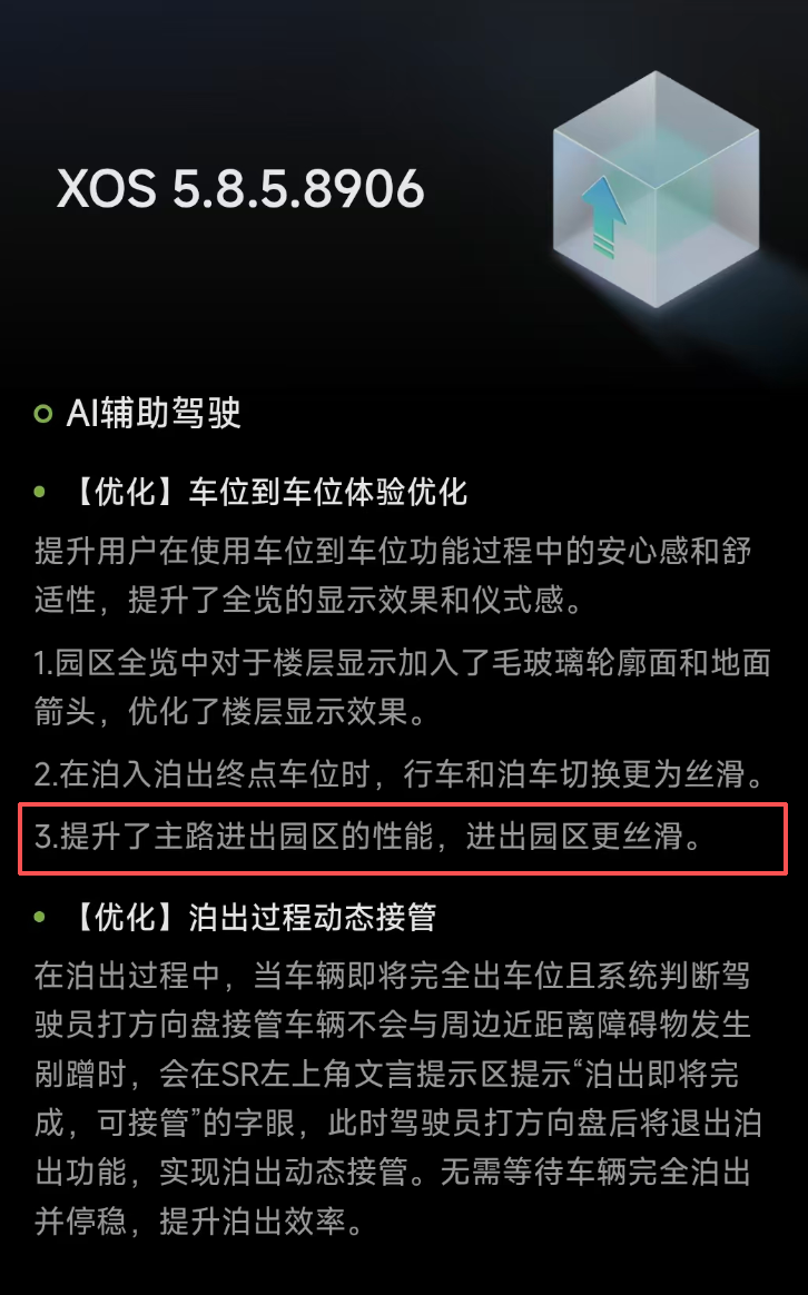 但是在我们本期视频即将发布之时,小鹏给用户推送的5.8.5版本中提到:提升了主路进出园区的性能,进出园区更丝滑。