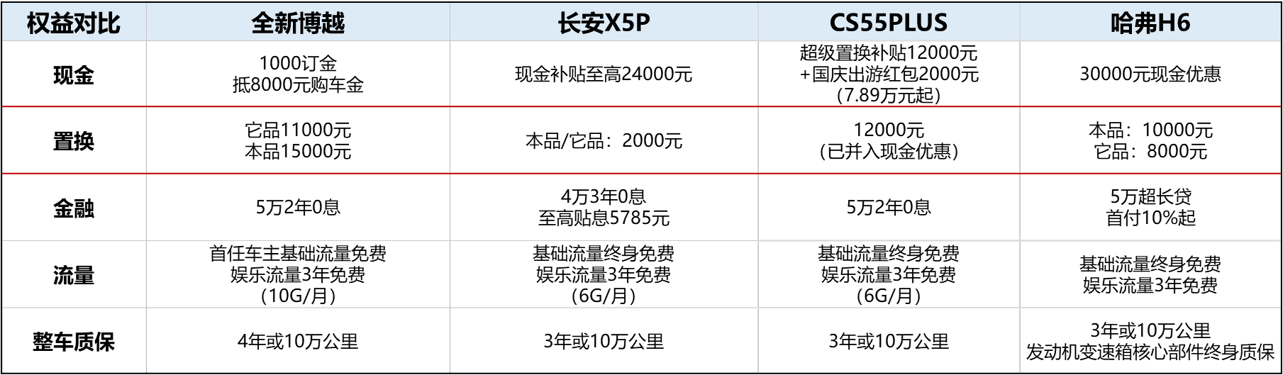 活动期间,用户换购全新博越可享至高15000元的限时置换补贴,且此补贴可与国家及地方的其他优惠政策叠加使用,实现权益最大化。这样的补贴力度对比同级别的长安CS55PLUS、哈弗H6、长安X5PLUS等产品有着明显的优势。并且,用户支付1000元定金后还可膨胀至8000元购车金,相当于能再享受7000元厂家现金直补。