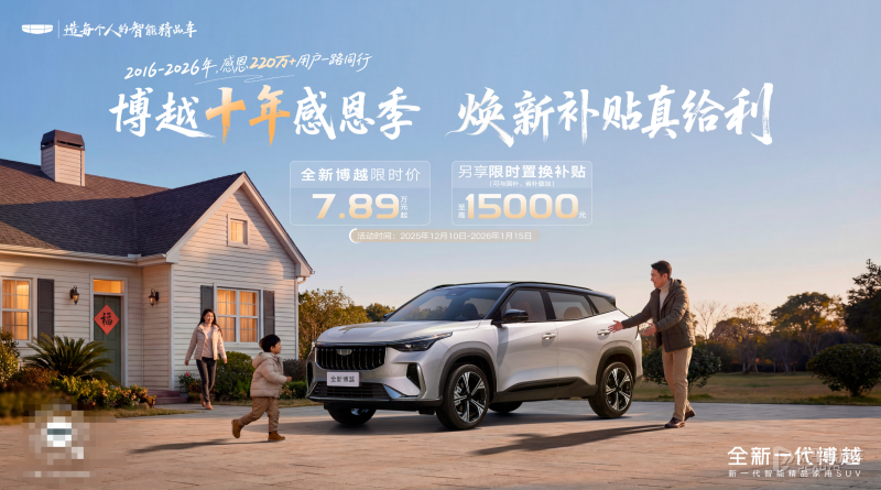 十年,是一个里程碑,更是一个新起点。从满足一代人的出行梦想,到不断迭代升级树立全新标准,博越的进化之路始终与用户相伴。全新博越此次“博越十年感恩季,焕新补贴真给利”限时购车补贴活动,不仅是诚挚的购车礼遇,更是一份对220万用户十年厚爱的郑重回应,旨在邀请更多家庭一同启程,共同驰往下一个十年。
