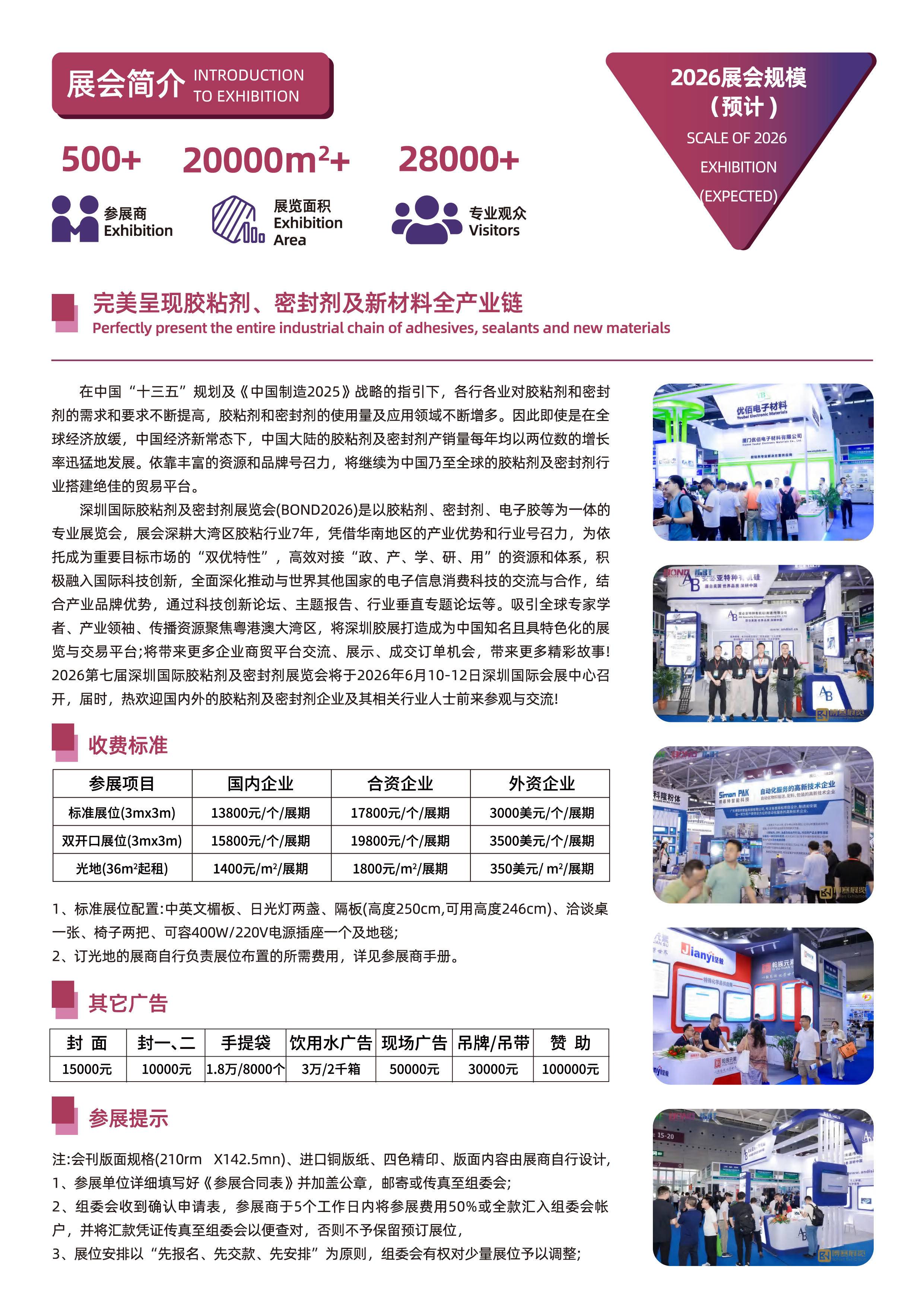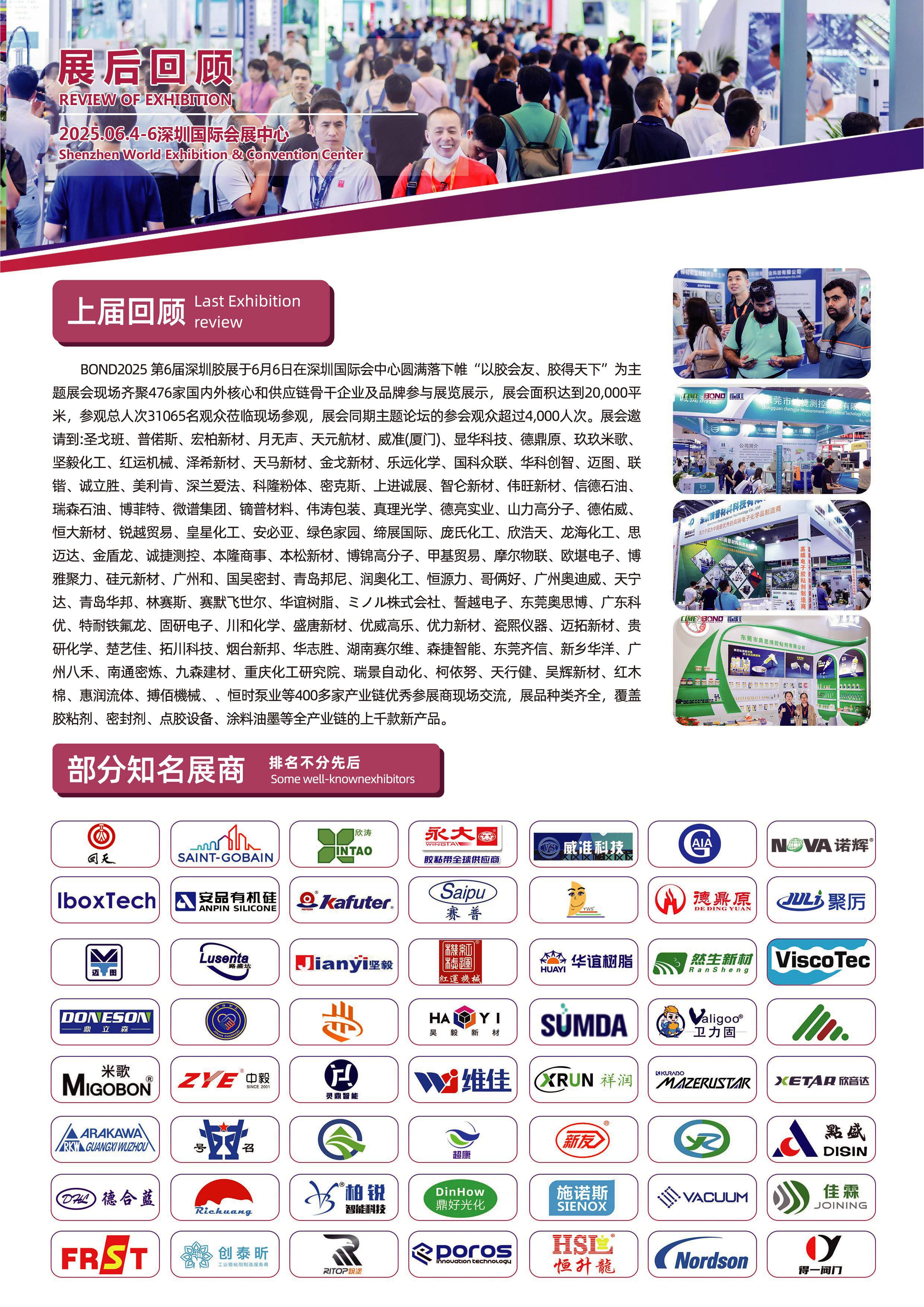 BOND第七届深圳国际胶粘剂展览会(简称“BOND 2026”)是胶粘剂及密封剂行业的重要专业展会,将于2026年6月10日至12日在深圳国际会展中心(新馆北登陆大厅)举行。