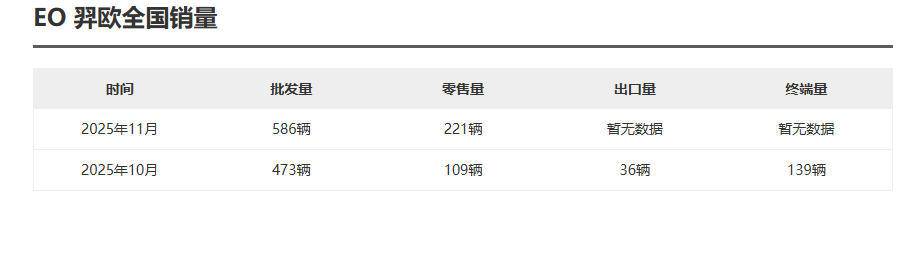 来自第三方平台的销量数据显示,其11月批发量为586辆,零售量则仅有221辆,要知道北京现代EO羿欧今年10月底正式上市,11月是其首个完整月的销量,但数百台的销量成绩恐怕难以令人接受,或者说难言成功。