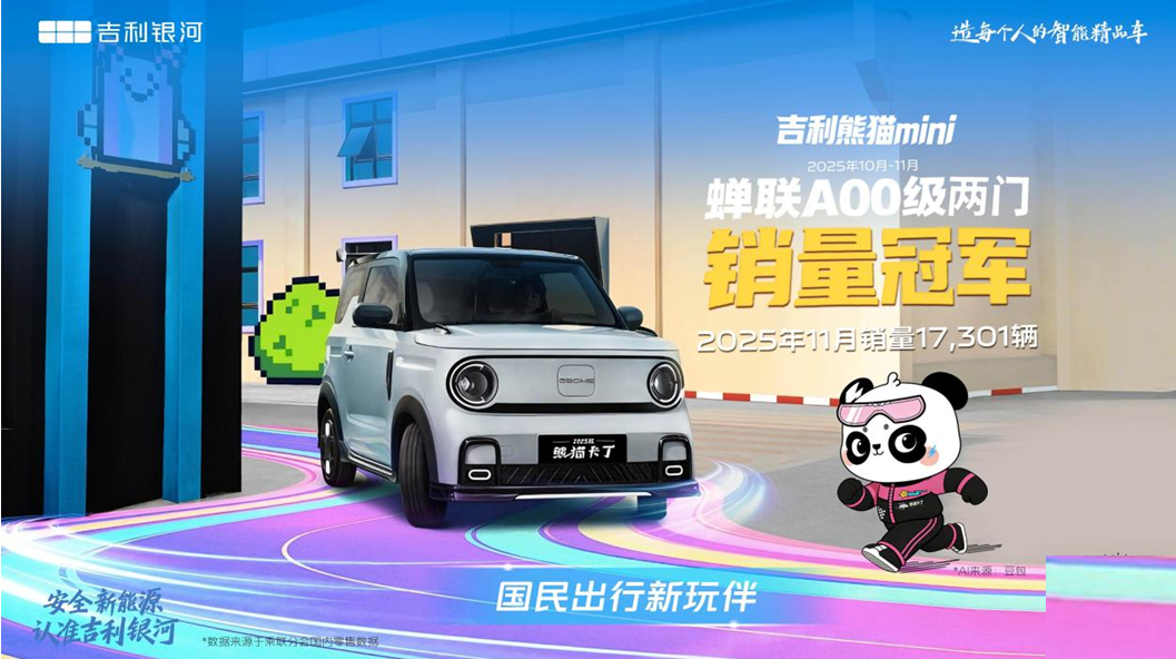 在竞争尤为激烈的A00级微型电动车赛道,吉利熊猫mini(参数|询价)表现格外抢眼,继10月夺冠后,于11月以17301辆的销量再度强势登顶,成功蝉联A00级两门车型销量冠军。截至11月底,吉利熊猫mini今年累计销量已突破15万辆,这一成绩不仅是吉利熊猫mini强悍产品力的实力圈粉,更让它稳居细分市场的“人气标杆”。优秀成绩的背后,是吉利熊猫mini以超越同级的产品实力对用户需求的精准回应。它凭借好看、好开、好玩的产品实力与越级品质,以“三大造型、八大实力、十五大同级领先”的越级体系,成为“国民出行新玩伴”。