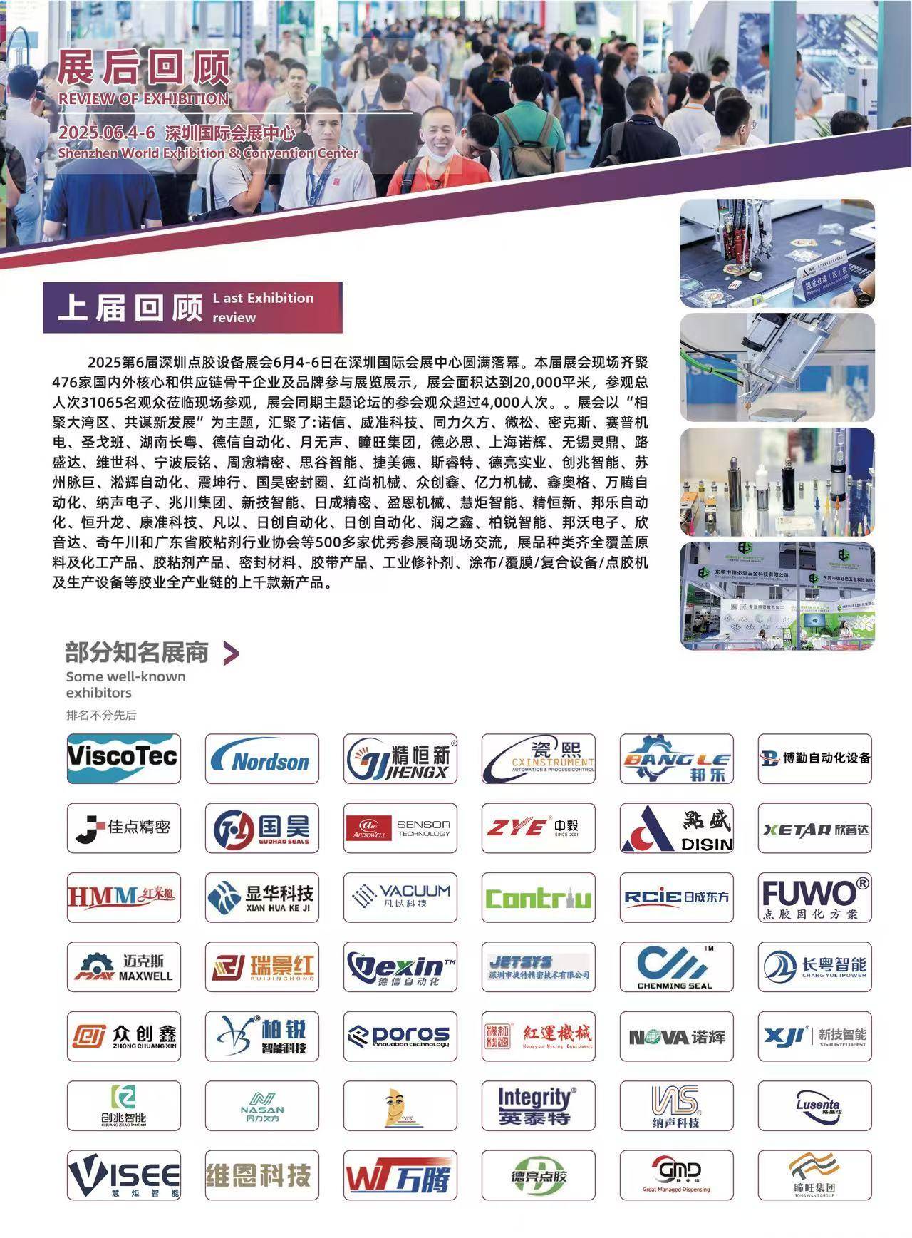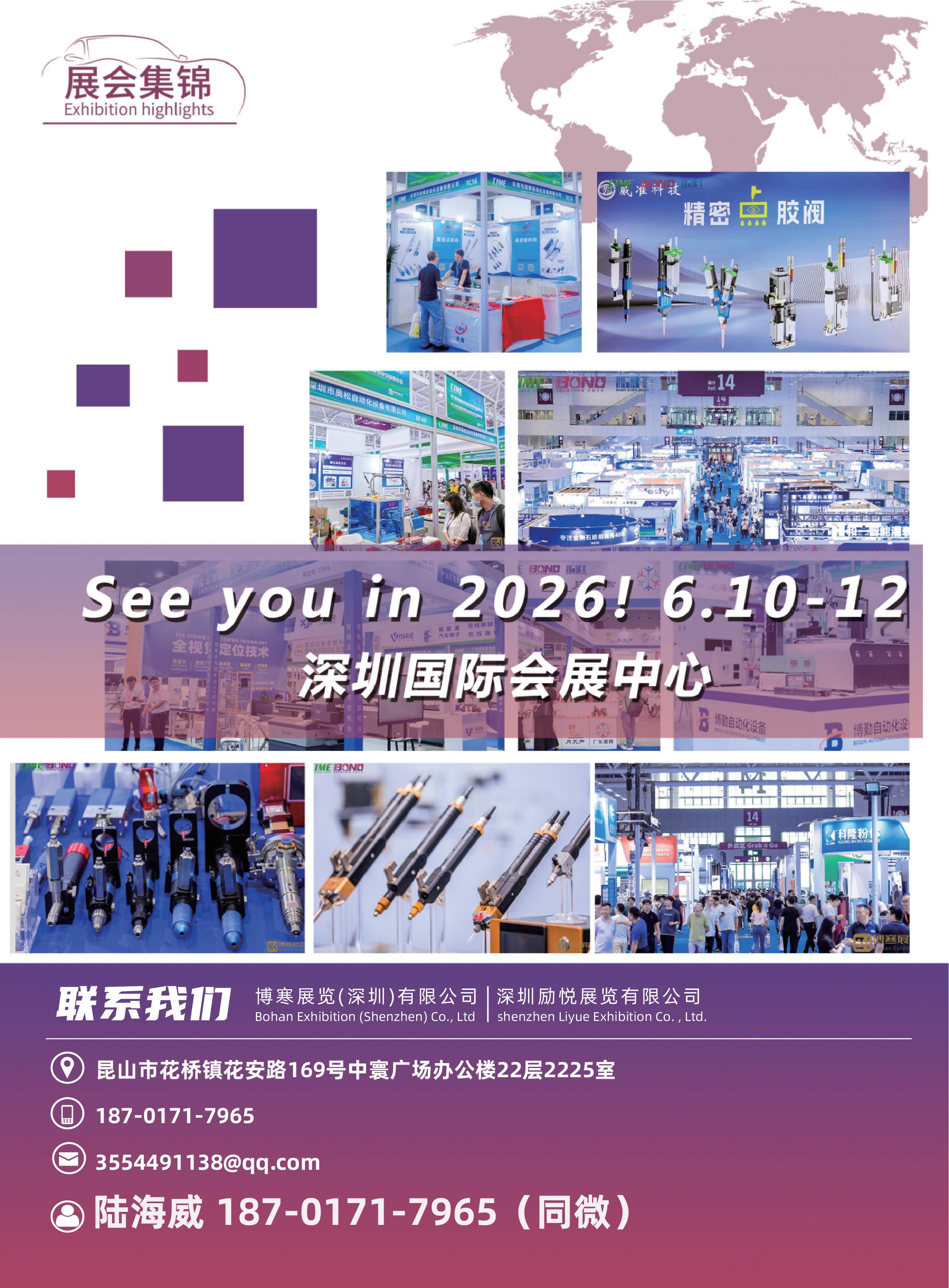 2026年深圳国际点胶设备、点胶耗材、点胶机、点胶阀展览会将于2026年6月10日至12日在深圳国际会展中心(新馆)举办,展会主题为“相聚大湾区、共谋新发展”,聚焦点胶技术及设备全产业链展示。