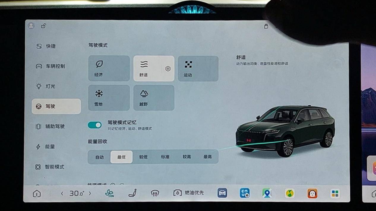 红旗HS6 PHEV在驾驶模式与能量管理上提供了颇为周全的搭配。车辆提供包括经济、舒适、运动在内的3种常规模式,以及针对特殊路况的越野与雪地模式,共5类驾驶选择。同时,其插混系统支持智能混动、纯电优先、燃油优先及增程模式共4种能量策略,用户可根据路况、电量与驾驶意图自由组合。