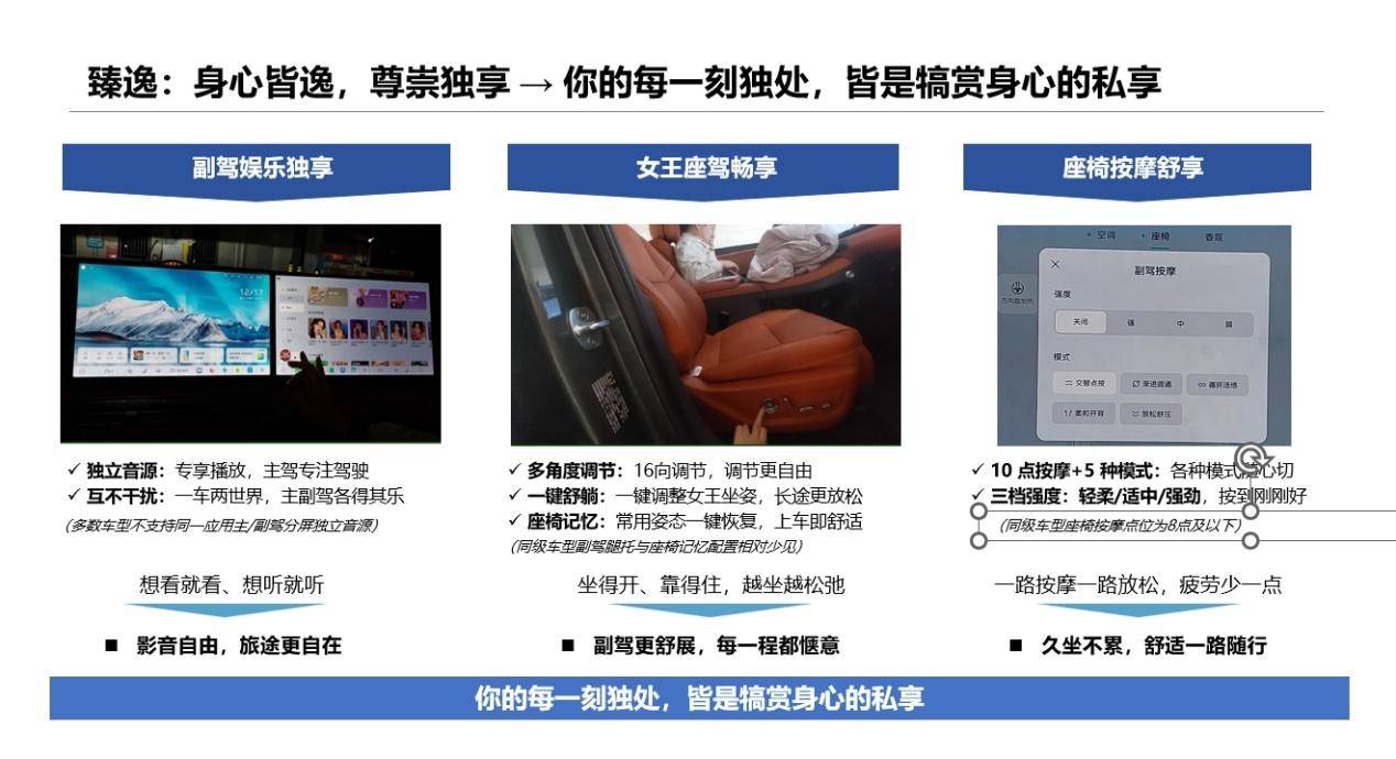 在副驾的舒适性打造上,红旗HS6 PHEV的“女王副驾”展现出了相当的诚意与巧思。它不仅支持16向多角度电动调节,为乘客提供了包括腿托、腰托在内的细致姿态调整空间;更配备了一键舒躺功能,可迅速将座椅调整至理想的零重力姿态,有效缓解长途乘坐的疲惫。