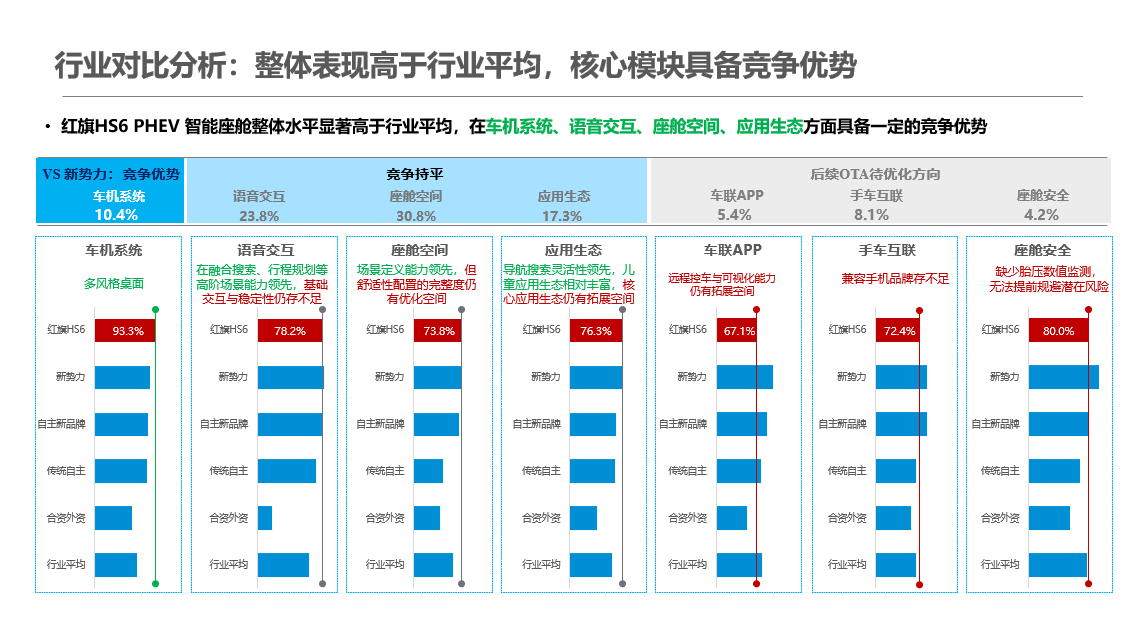 红旗HS6 PHEV在最新《CC-1000T 智能座舱评测体系》中,以1027分的成绩荣获“智能座舱体验卓越级”称号,强势登榜年度“十佳品牌智能座舱”评选。这标志着其智能化水准已稳居行业第一梯队。值得注意的是,该阵营长期以来几乎被鸿蒙智行、小米、理想、蔚来、小鹏等新势力品牌所占据,连传统豪华品牌BBA也屡屡难以突破。红旗HS6 PHEV 不仅成为其中极为稀缺的传统车企代表,更推出了17.88万元起的诚意售价。此番表现,充分印证了红旗HS6 PHEV 已在智能座舱领域实现显著突破,强势跻身第一梯队。那么,它究竟强在何处?接下来我们将逐一详解。