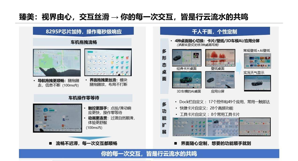 如果你听过红旗车型的九章智能平台,那肯定对灵犀座舱不会陌生,红旗HS6 PHEV依旧是我们熟悉的灵犀座舱,但“配方”可以说是全面升级,其精髓便是5nm级别的8295P车规级芯片,相比8155芯片或同级别的“国产芯”,NPU算力达到了46 TOPS,这意味着更流畅的语音交互,更丝滑的的操作体验,以及更清晰的屏幕显示效果。