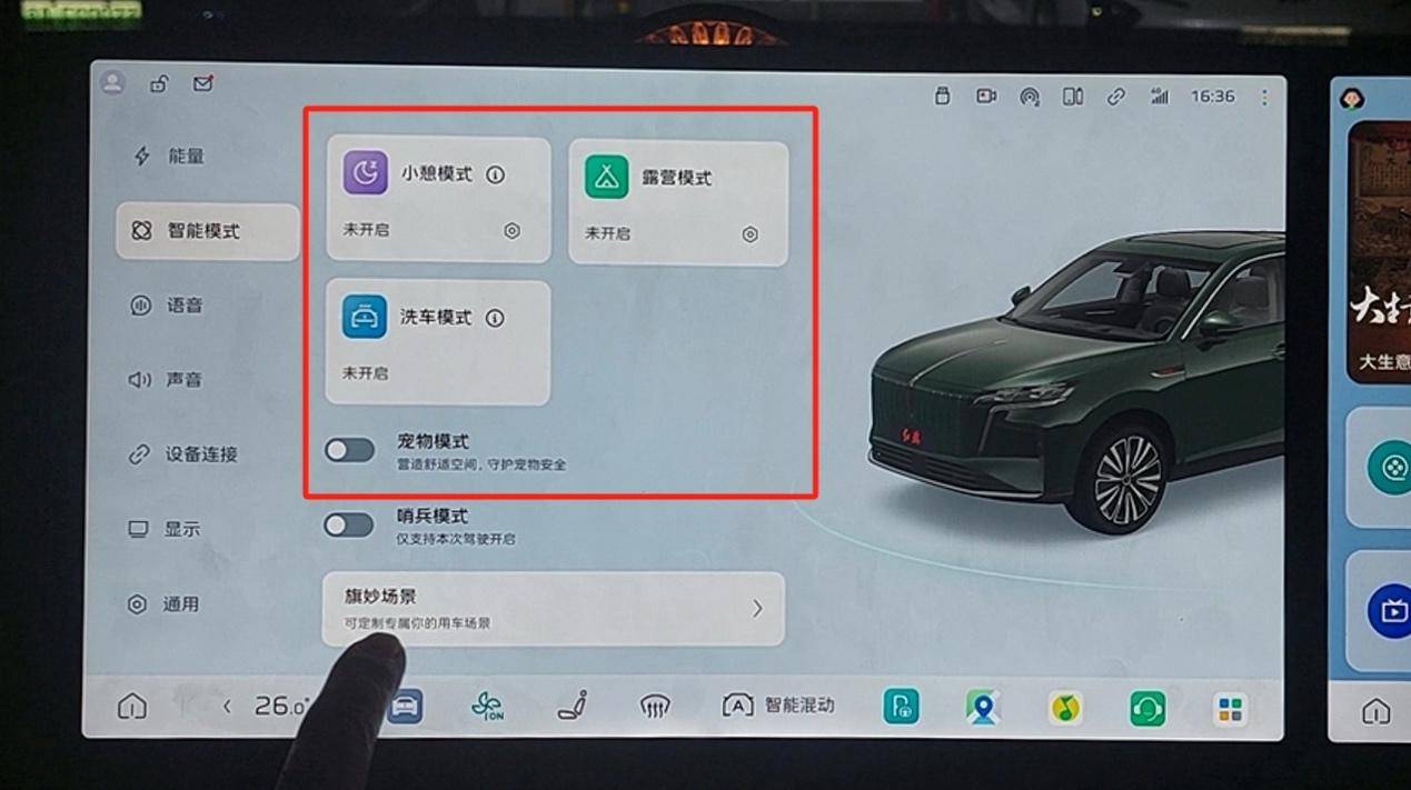 红旗HS6 PHEV 的拥有多种场景模式,通过预设场景模板,提供小憩、露营、宠物、洗车等一键场景切换,简化设置过程。例如在小憩模式下,座椅自动调整到舒适姿态,并且把空调调至舒适温度,配合白噪音,可以在工作日的午间轻松休息。除固定的场景模式外,配合多屏联动,还可以协同实现观影、游戏或K歌的环绕式体验,增强氛围的投入感。