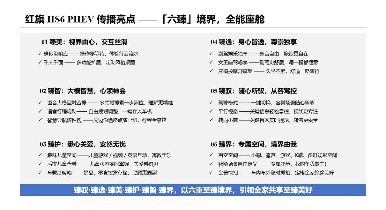 红旗HS6 PHEV取得1027分的卓越成绩,并荣获“十佳品牌智能座舱”称号,并不是以上的硬件配置的简单堆砌,更是在座舱体验方面的精细打磨。从功能维度来看,在内容生态方面,红旗HS6 PHEV在内容生态方面覆盖全面,包括音频、有声、视频以及游戏等,不同应用间适配的界面一致性也较好,没有跳脱感。语音方面,红旗HS6 PHEV对话流畅,语音车控全面,在接入豆包大模型后,百科、主动服务方面的表现更加全面。场景模式自定义方面,红旗HS6 PHEV条件设计合理,执行项目丰富,上手也没有丝毫难度。车机系统方面,丰富的壁纸选择,以及多风格桌面给我留下了深刻印象。围绕红旗HS6 PHEV在智能座舱方面的特点,我们归纳了六大特点,统称为“六臻”,下面我们逐一进行介绍。
