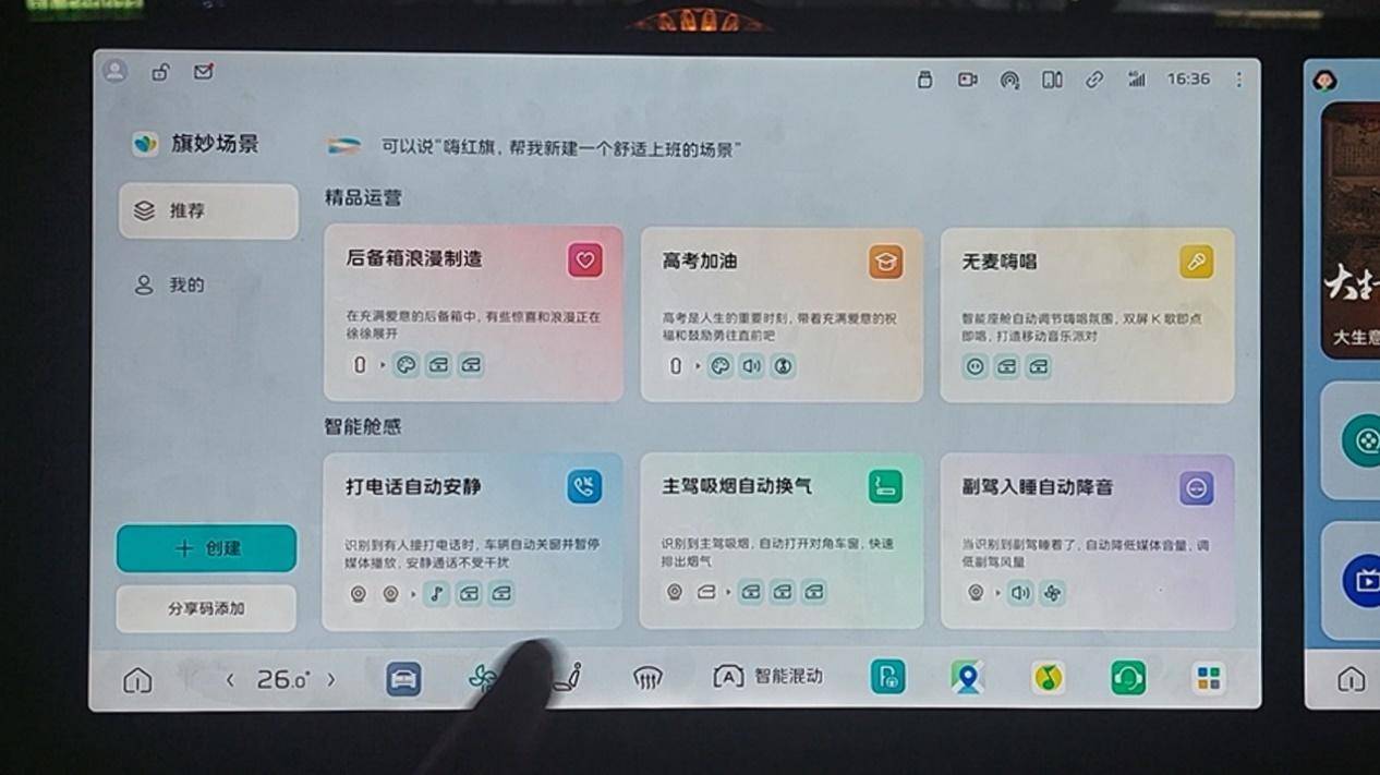 红旗HS6 PHEV的旗妙场景是一款可以自定义场景模式的应用,为用户提供了高度自由的个人想象。首先它覆盖功能非常全面,涵盖空调、座椅、灯光、娱乐等16个核心功能模块,此外触发条件简单易懂,没有丝毫的学习成本。当然,它也支持你通过语音指令快速创建。例如你可以和它说“创建一个下班提醒我打卡的场景模式”,这样在你下班上车的时候,红旗HS6 PHEV就可以提醒你,是不是非常的方便。