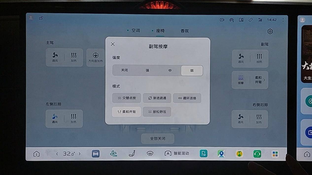 在座椅舒适性配置上,红旗HS6 PHEV的座椅按摩系统提供了颇为细致的体验。其采用10点式气动按摩机构,支持交替点按、渐进疏通等5种专业按摩模式,并可进行轻柔、适中、强劲三档强度调节,允许乘客根据自身疲劳状况精准选择。对比市面上常见的8点按摩配置,更多的点位意味着对肩背、腰部等关键肌群能有更贴合、更到位的舒缓覆盖。