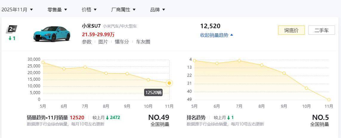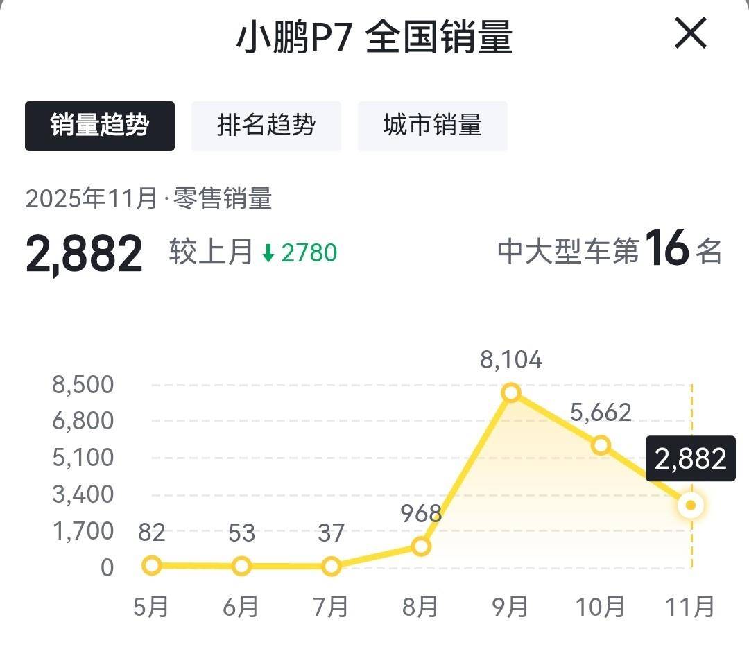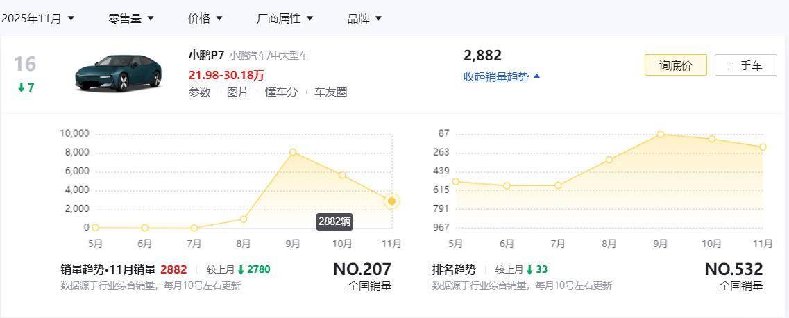 大家或许都没有发现,今年8月27日才正式上市的全新一代小鹏P7(参数|询价),居然已经在10月、11月连续两个月出现销量下滑了。要知道,这款车在9月份可是售出去了8104辆新车,但在10月和11月份,却分别只取得了5662辆和2882辆新车的销量成绩单。那至此也就不禁让我们想要问:全新小鹏P7这是又要卖不动了吗?