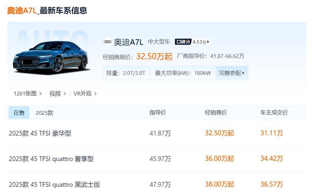 你要说价格,指导价41.87-66.62万元区间的奥迪A7L目前在终端已经出现了很大幅度的优惠。单从各主流汽车网站平台上看,奥迪A7L的最低配车型报价就已经来到了32万多。