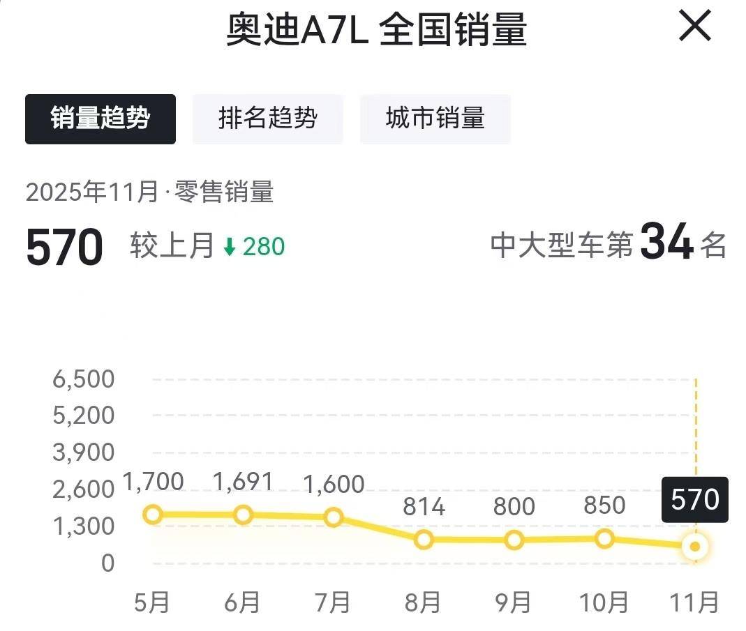 一个很可悲的事情,明明长得比奥迪A6L(参数|询价)要更符合年轻人审美,开着的操控性和舒适性感受也更好,但最近几个月奥迪A7L(参数|询价)的销量数据却仍仅仅只有几百台,这是让我们所万万没有想到的。