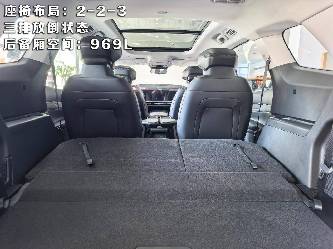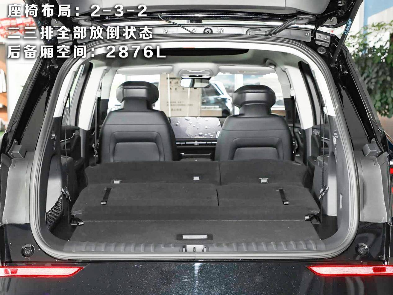 不止坐得舒服后备箱空间同样惊喜,在三排座椅全部启用的情况下,仍有309L的容积,能轻松放下3个20寸登机箱和一些随身行李,全家出游也不用担心车内空间不足;如果放倒第三排座椅,容积瞬间拓展至969L,过年回家装下父母的爱心年货绰绰有余;要是需要装载大件物品,2-3-2座椅布局可以将二排和三排座椅全部放倒,能形成2876L的超大纯平空间,露营装备、婴儿车甚至小型家电都能轻松容纳,空间灵活性堪称“移动的家庭仓库”。