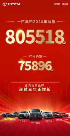 2025年,一汽丰田全年销售新车805518辆,成为连续三年实现正增长的主流合资品牌,品牌向上向新的势头更加明显。其中TNGA-K平台以上高端车型销售487426辆,同比增长12%,占比达61%;智能电混双擎全年销量380100辆,同比增长14%,占比达47%。明星车型皇冠陆放(参数|询价)全年销售59902辆,同比增长14%;RAV4荣放(参数|询价)全年销售204272辆,同比增长6%;亚洲龙(参数|询价)全年销售126703辆,同比增长39%,展示了强劲的向上势头。