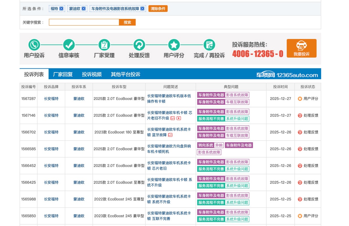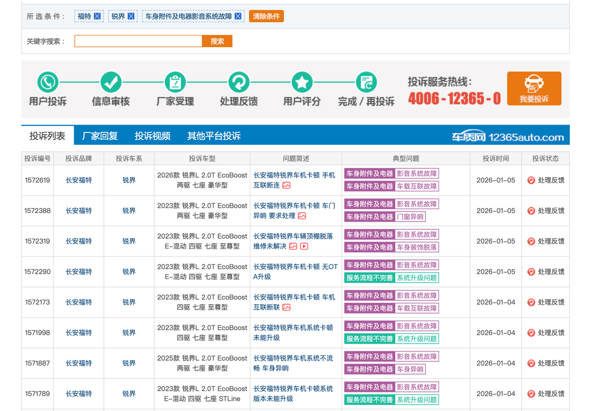 1月初,车质网发布了2025年12月车辆投诉榜单,根据榜单显示长安福特成为榜单中最受争议的品牌——旗下蒙迪欧(参数|询价)以447起投诉登顶全品类榜首,锐界(参数|询价)以148起投诉跻身第六名,两款车型核心投诉问题高度重合,直指车机系统缺陷,凸显长安福特在智能配置品控与售后应对上的双重短板。