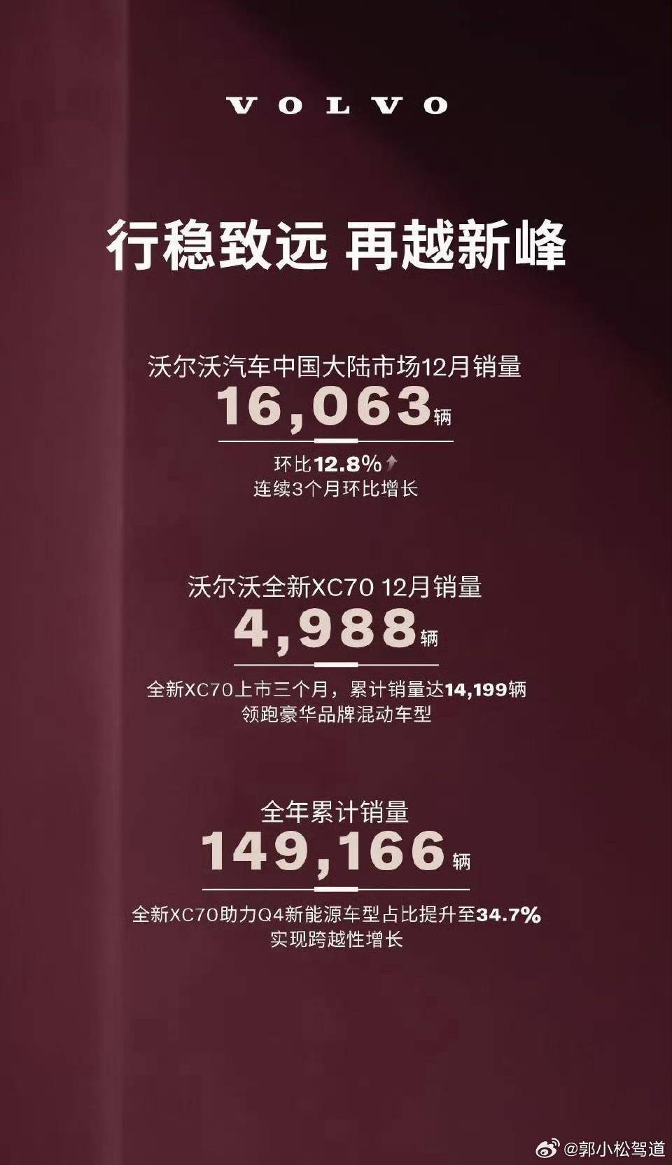 2026年1月份,沃尔沃公布了2025年销量数据,给这家百年豪华品牌的中国之旅再添一层阴霾。根据数据显示,2025年12月沃尔沃在中国大陆市场售出16063辆,虽环比增长12.8%,但同比仅微增不足100辆;全年累计销量更是跌至149166辆,同比2024年下滑4.6%。这不仅是沃尔沃近7年来的最低销量,更是其在华连续第二年下滑——2024年其销量已同比下滑8.2%至156370辆。