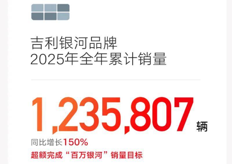 得益于多款爆款车型的强势发力,吉利银河在2025年超额完成销量目标。数据显示,品牌全年销量从2024年的49万辆跃升至124万辆,同比大幅增长150%;这一成绩贡献了吉利新能源板块169万辆总销量的73%,让吉利银河成为吉利新能源车板块的绝对主力。