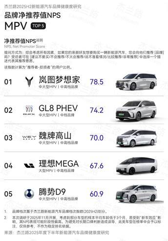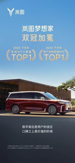1月10日数据显示,岚图梦想家(参数|询价)在2025年下半年销量为43191台,再次蝉联高端MPV第一,2025全年达到80248台,同比增长46%。另据杰兰路发布的《2025年度下半年新能源汽车品牌健康度研究(NPS篇)》,岚图梦想家在2025年下半年以78.5分的净推荐值(NPS)位居新能源MPV榜首。作为豪华旗舰MPV,岚图梦想家在2024年、2025年连续蝉联MPV用户净推荐值第一,成为销量与口碑的“双料冠军”,持续引领中国高端MPV。