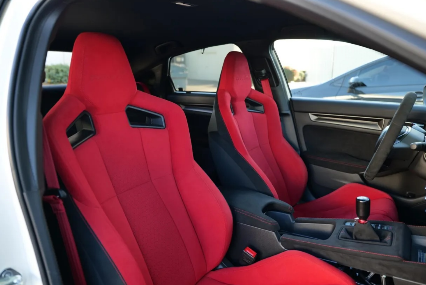 这辆备受瞩目的思域Type R采用了经典的“冠军白”(Championship White)车色,内饰为标准的红黑配色。最令人惊讶的并非它的稀有性,而是它的使用状况与最终成交价格。该车行驶里程已达约45,000公里——对于一辆仅出厂约3年的性能车来说,已属于高强度使用。