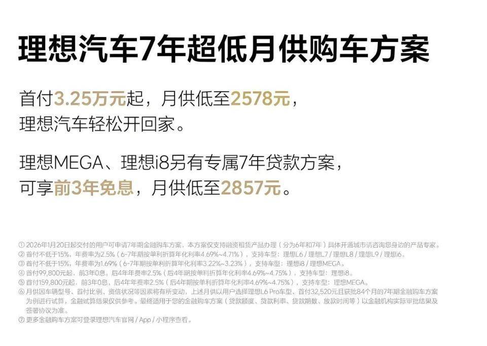 这是继特斯拉和小米之后,第三家在中国推7年分期的新势力。特斯拉1月6日率先出手,给Model 3和Model Y上了7年低息贷;小米1月15日跟进,为YU7也搞了类似政策。理想这次动作很快,明显不想掉队。