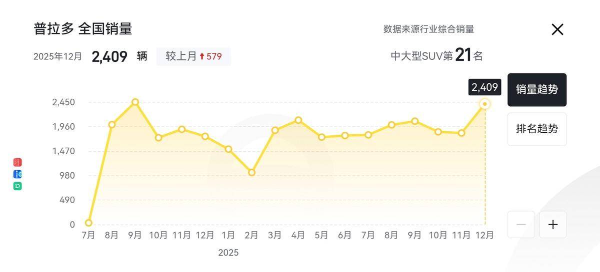那卖车还没到2年时间就开始官降,是否也就意味着厂家确实是想要拉一拉这款车的销量呢?从最新的2025年12月份销量数据来看,全新普拉多共计卖出去了2409辆新车,作为一款平均售价在45万以上的中大型硬派越野SUV,这样的成绩我觉得其实还是挺不错的。
