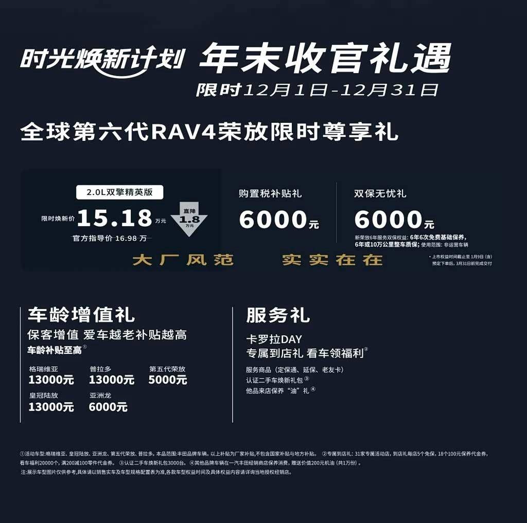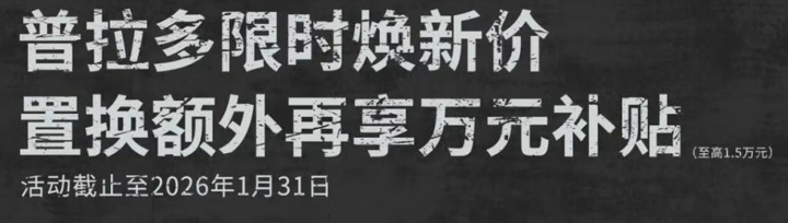 看到这,我们会发现,全新普拉多虽然官方降价了,但却只是暂时的行为。毕竟,在一汽丰田这则全新普拉多降价的海报通知中还有一行字,那就是活动截止至2026年1月31日。也就是说,限时焕新价的优惠是1月份专属,至于后续还会不会有这样的优惠,那就要看厂家“心情”了。