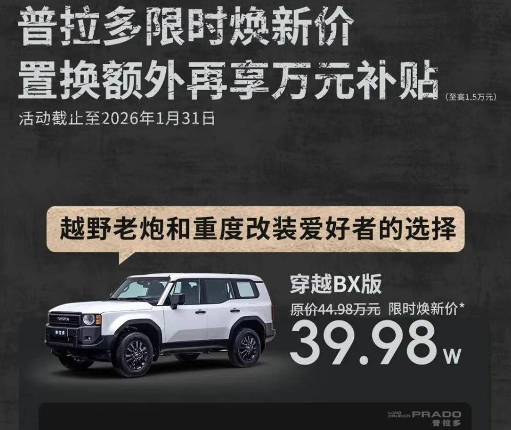 至于具体价格,一汽丰田把原本售价44.98万元的普拉多 穿越BX版,给到了39.98万元的限时换新价,并为其打上标签“越野老炮和重度改装爱好者的选择”。