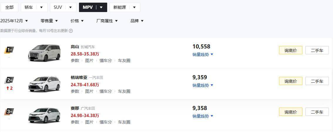 说实话,在2025年12月的MPV销量榜里,一汽丰田格瑞维亚与广汽丰田赛那还能分别交出9359辆和9358辆新车的销量成绩单,这表现确实还是挺不错的。要知道,就算是丰田赛那优惠完以后的最低价,其也还是需要25万的价格才能买,那这么一算下来,落地至少也就奔着30万去了。因此,眼下手握30万预算买MPV,丰田赛那和格瑞维亚的确就是不少人心中认为相对偏稳妥的选择。