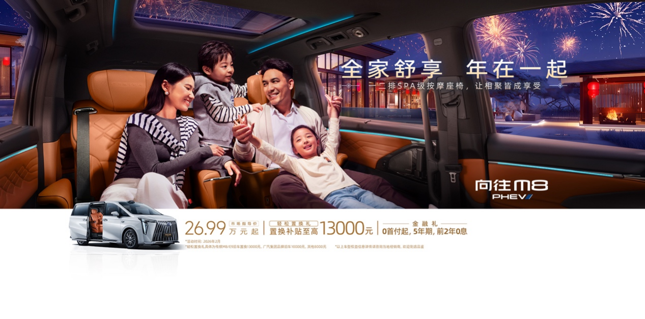 新春购车享多重礼遇,传祺向往M8享置换补贴至高13000万元,5年分期前2年0息金融政策以及价值20000元的华为乾崑智驾ADS高阶功能包补贴,从续航保障到智能护航,从尊享舒坐到全域安全,传祺向往M8以全维实力守护出行,让春节团圆路既是归途,亦是享受。开传祺车,过中国年!
