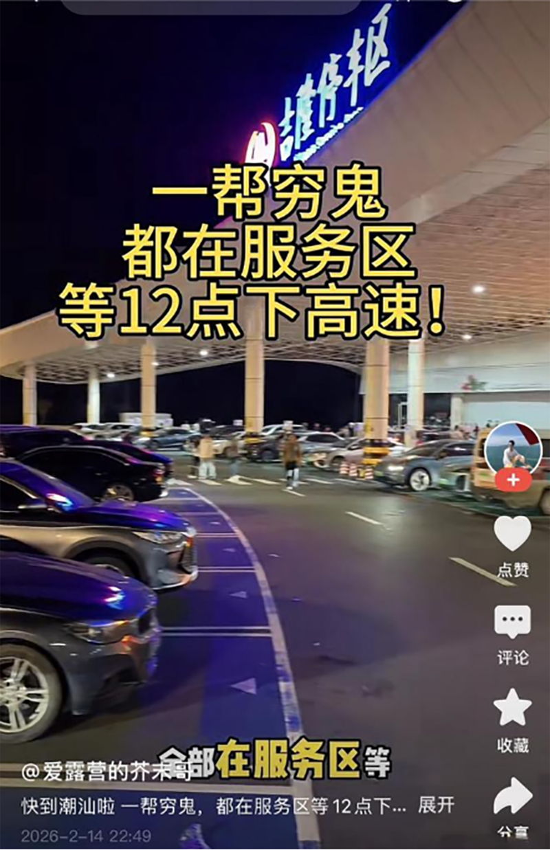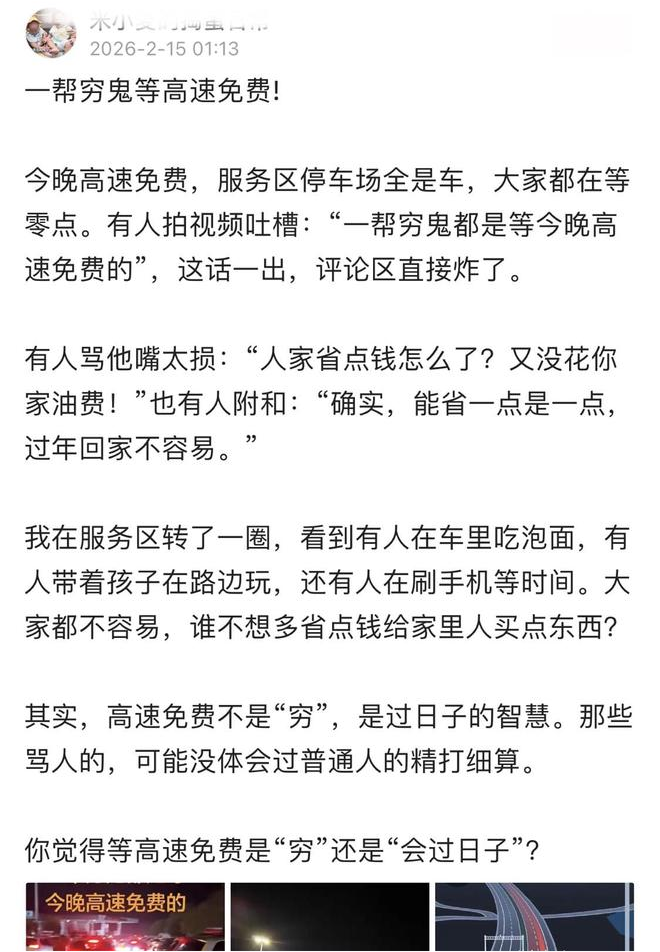 2026年2月15日0点,正式进入本年度春节长假;同时,高速公路也正式开始免费通行,然而就在这热闹非凡的一幕里出现了刺耳的声音!一名广东网友发帖,称这是“一帮穷鬼等高速免费!”该评论随即引发热议。