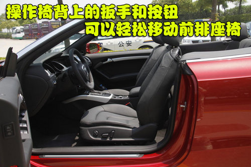 奥迪A5 Cabriolet敞篷版由于采用双门四座设计,所以后排乘客上下车需要移动前排驾驶座椅。通过操作前排座椅椅背上的扳手和按钮,可以轻松移动前排座椅。