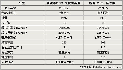 新款锐志和睿翼的排量都在2.4这个区间,并且都具备了日系发动机传统的特点:性能良好、油耗经济,但是发动机形式却完全不同。从官方公布的等速油耗来看,睿翼轿跑的油耗要低于丰田新锐志,但是新锐志采用了V型 6缸发动机,该发动机运用了双VVT-I技术,因此在动力方面明显要优越于睿翼,同时再加上锐志为后驱车型,再加上百公里加速仅为9秒,就从这两点就也可以看出锐志的运动特性。在变速器方面,锐志略胜一筹,配备了手自一体式6速自动变速箱,换挡会更加平顺。