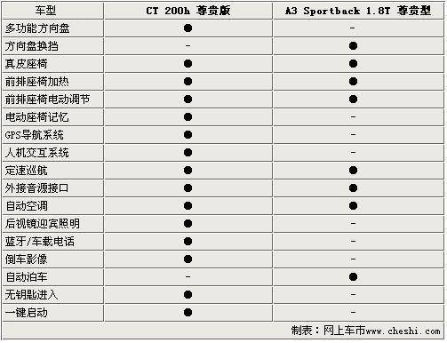 从舒适性配置上来看,这似乎又是CT200h的一次胜利。虽然两款车型均配备了前排座椅电动 调节与加热等功能,但CT200h的诸多人性化配置却是奥迪A3所不具有的,在面对GPS导航、倒车影像、一键启动等配置时,A3也仅有自动泊车与换挡拨 片等少数迹象配置可以叫板CT200h。
