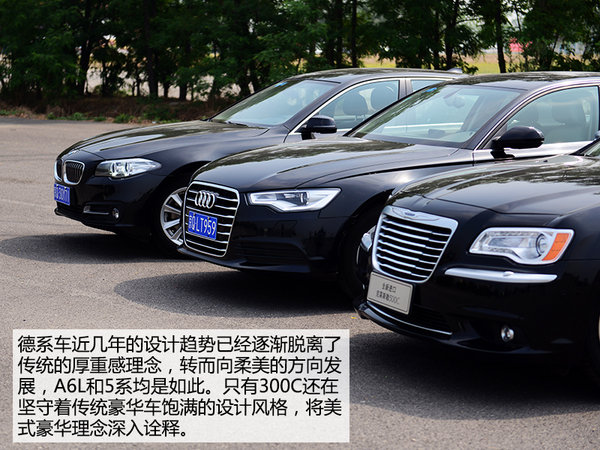 对于三款车的外形设计的评价,还要看每个人的喜好而定。就我个人的看法,5系是三款车当中商务气息最不浓郁的,不过这只是单纯从设计角度出发的,毕竟宝马的车设计的都比较时尚。而A6L和300C却存在着不少共通之处,大面积的中网设计和相对浑厚的车头风格,似乎更适合那些比较传统的使用者,而再通过进行细化对比,300C纯正的美式高头大马的设计风格,似乎更能够诠释身份和地位的象征。