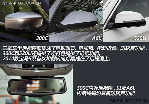 外观配置方面,三款车型均配备了氙气大灯、日间行车灯、自动大灯功能,300C独有转向辅助灯以及车内氛围灯、A6L不提供前雾灯。300C提供了无钥匙启动及进入系统,其余两车只有无钥匙启动功能,便利性不急300C。另外300C还具备两次按键启动车辆功能。ACC自适应巡航系统、全景天窗和内后视镜防眩目功能也都是300C独有的配置。
