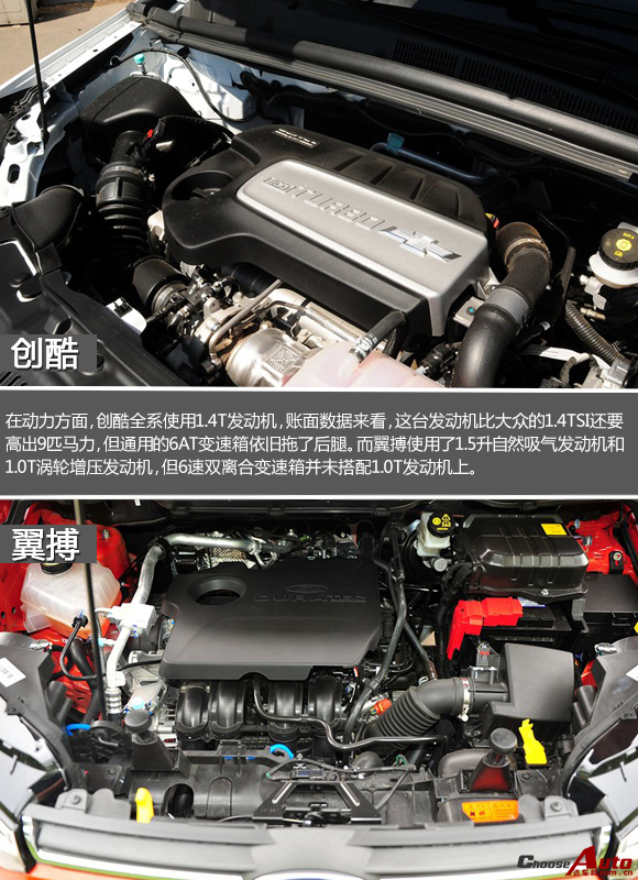 在动力方面,创酷全系使用1.4T发动机,账面数据来看,这台发动机比大众的1.4TSI还要高出9匹马力,但通用的6AT变速箱依旧拖了后腿,并且创酷的自重达到了1.4-1.5吨,因此我们并不期待创酷有很强的加速能力。翼搏使用了1.5升自然吸气发动机和1.0T涡轮增压发动机,但6速双离合变速箱并未搭配1.0T发动机上。不过从福特在华的趋势来看,这款6速双离合变速箱刚刚现身1年多,就开始着手退出,我们有理由相信未来翼搏改款时,也许变速箱方面会有较大的变化。