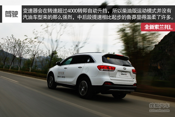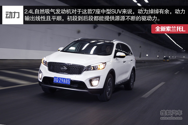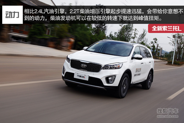 索兰托L的2.4L车型驾驶起来不会感觉到自重很大,由于采用了缸内直喷技术,使得它的最大功率与扭矩比老款引擎有小幅度的提升。2.4L车型测得百公里加速为10.9秒,表现还是非常出众的,2.2T柴油机型则要比2.4L汽油机型低速动力强劲许多,深踩下油门的瞬间,柴油机强大的低扭会马上直观的感受出来,在很低的转速涡轮增压就会介入,并且很快达到峰值。