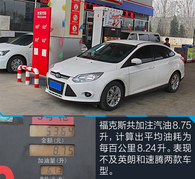 测 试全程将近用了4个小时,根据行车电脑计算,平均车速在28km/h左右。到达终点加油站,三辆车分别将油箱补满。汽油依然是加至与油箱口持平的位置。三 车中,英朗共加注汽油7.83升。计算出平均油耗为每百公里7.51升,在三车中油耗是最低的。速腾共加注汽油8.2升。计算出平均油耗为每百公里 7.76升。应该说表现并不比英朗差太多,油耗水平也比较令人满意。福克斯共加注汽油8.75升。计算出平均油耗为每百公里8.24升,表现逊色于另外两 款车型。