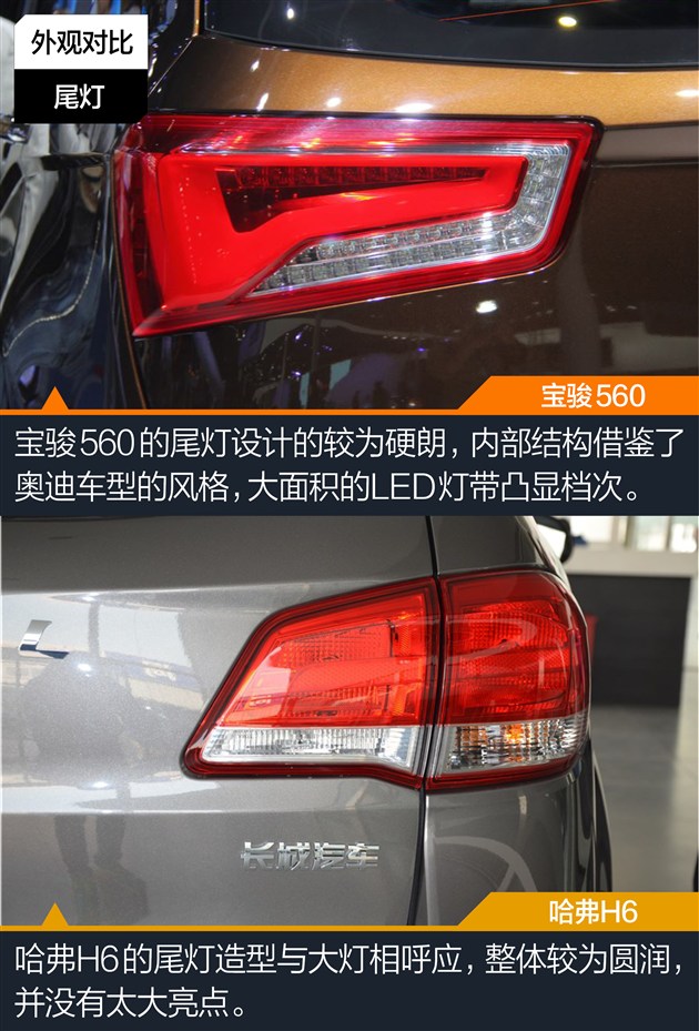 外观小结:宝骏560延续了家族的设计特点,相比哈弗H6,560的外观更加的时尚,抛光铝合金轮圈、LED日间行车灯及带状LED尾灯,都更加富恶化现代人的审美。