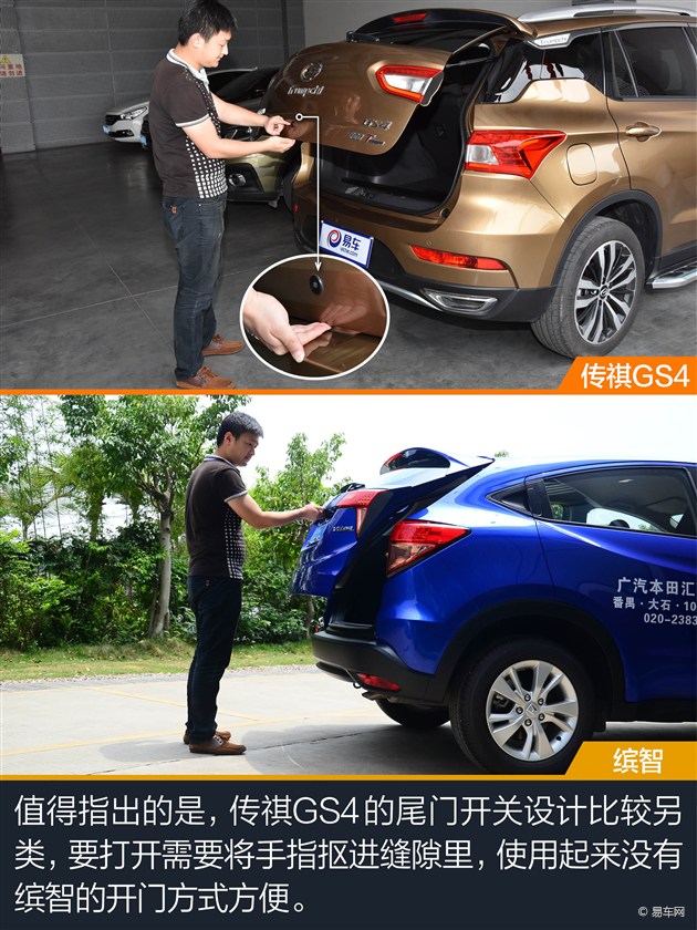 外观小结:两车外观造型风格见仁见智,不过从传祺GS4的造型设计风格来看,它给人自主品牌在车辆设计方面趋于成熟的印象,就这方面我得给传祺点个赞。在细节处理方面传祺GS4还有可以完善的地方,比如后备厢的开启方式就没有缤智的那么好用。