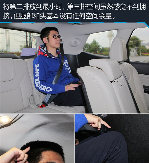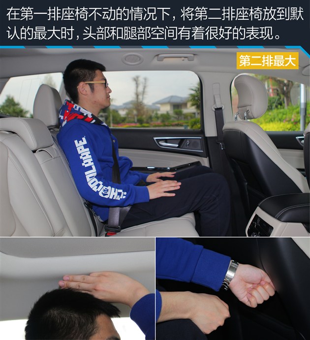 身高180cm的体验者坐在第二排,可以获得三指左右的头部空间以及超过两拳的腿部空间。而身高178cm的体验者坐在奥迪Q5的第二排,可以获得一拳的头部空间以及一拳的腿部空间。