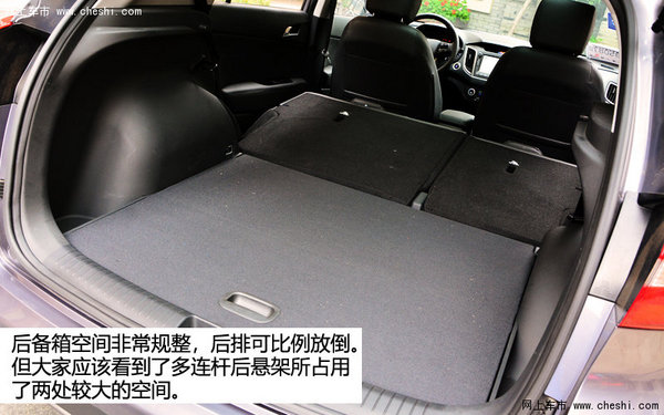 乘坐空间是ix25的另一个优势,尤其是后排的腿部空间和整体的横向空间都超过同级表现。后排座椅的中部乘客乘坐感觉也还不错,地板的中央隆起并不高。后备箱空间非常工整,后排座椅能够放平,支持比例放倒。