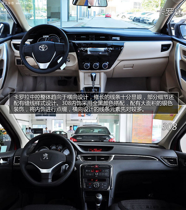 卡罗拉方向盘采用三幅样式设计,方向盘中间位置还采用缝线样式设计,但是整体给人的感觉依然很运动,三个表盘样式的仪表盘看上去更加年轻化,中控台背板采用了钢琴烤漆元素搭配,看上去很时尚。308方向盘采用真皮包裹,四个表盘的仪表盘周围配有镀铬装饰,中控台顶部为空调出风口,下方为按键控制区。