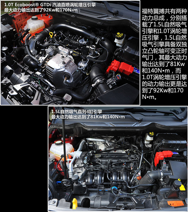 福特翼搏共有两种动力总成,分别搭载了1.5L自然吸气引擎和1.0T涡轮增压引擎,这两款发动机都具备了不错的节油性能。至于动力性能,1.5L自然吸气引擎具备双独立凸轮轴可变正时气门,其最大动力输出达到了81Kw和140N?m,而1.0T涡轮增压引擎的动力输出更是达到了92Kw和170N?m。而在变速箱方面,福特翼搏装备了全新的PowerShift 6速双离合变速,这款变速器能够提供传统手动变速箱的快捷响应和自动变速箱的便利性,另外,福特还为翼搏者提供了5速手动变速箱,以满足不同消费者的需求。